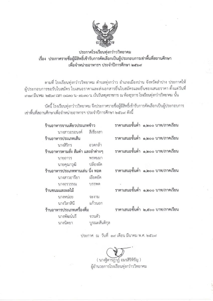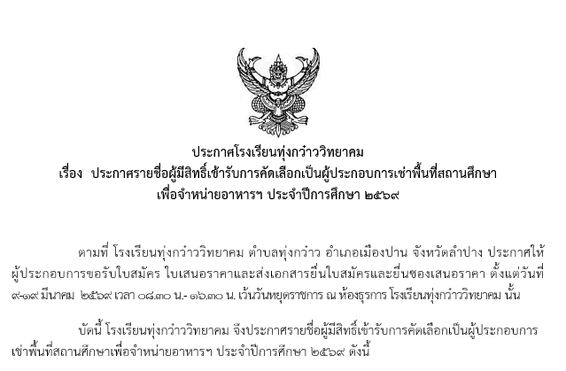 ประกาศโรงเรียนทุ่งกว๋าววิทยาคม เรื่อง ประกาศรายชื่อผู้มีสิทธิ์เข้ารับการคัดเลือกเป็นผู้ประกอบการเช่าพื้นที่สถานศึกษาเพื่อจำหน่ายอาหารฯ ประจำปีการศึกษา 2569