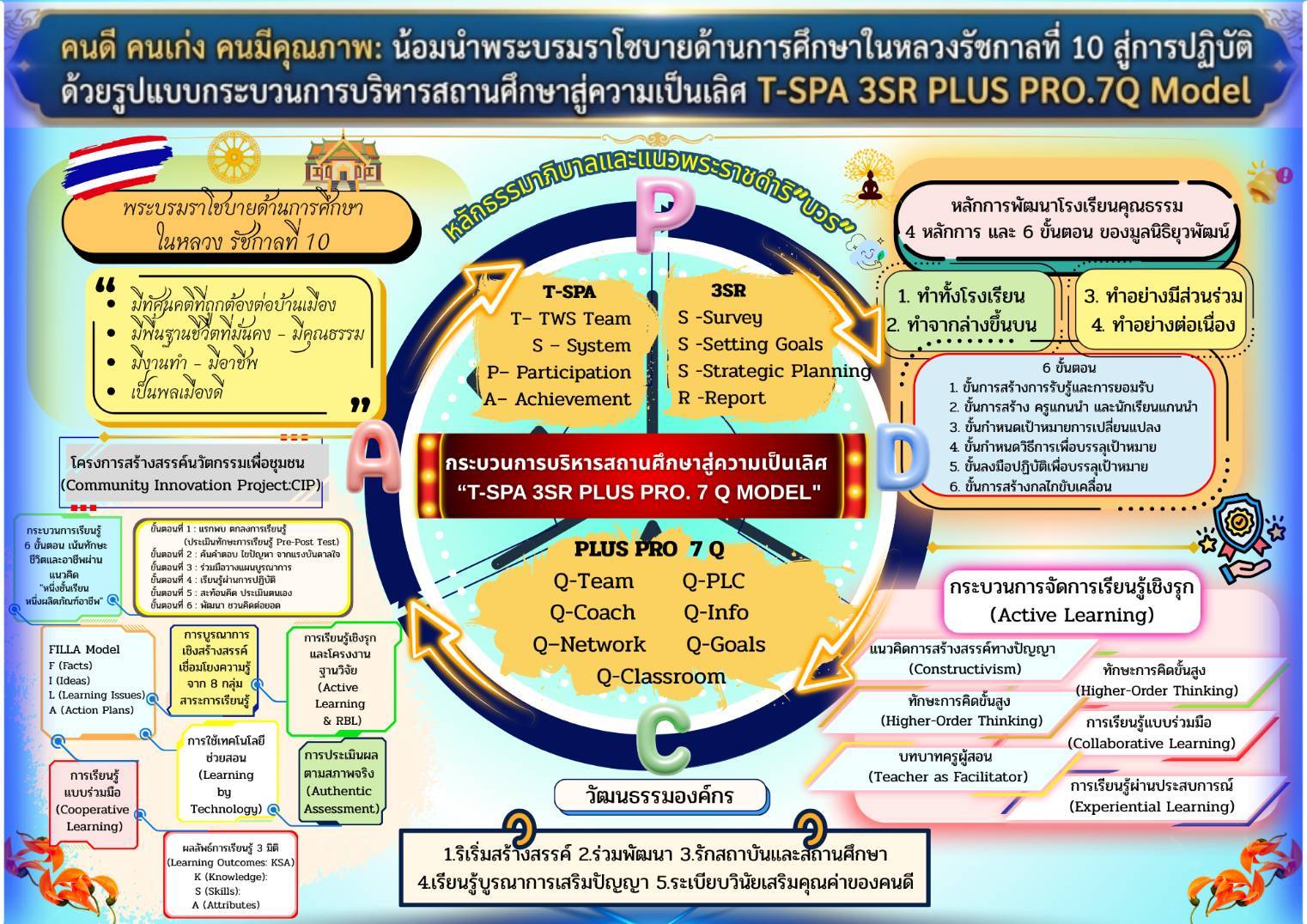 สู่การปฏิบัติ โดยการบูรณาการแนวปฏิบัติที่เป็นเลิศในทุกมิติ ด้วยกระบวนการบริหารสถานศึกษาสู่ความเป็นเลิศ T-SPA 3SR PLUS PRO.7Q Model เพื่อพัฒนาผู้เรียน ด้วยนวัตกรรม "คนดี คนเก่ง คนมีคุณภาพ"
